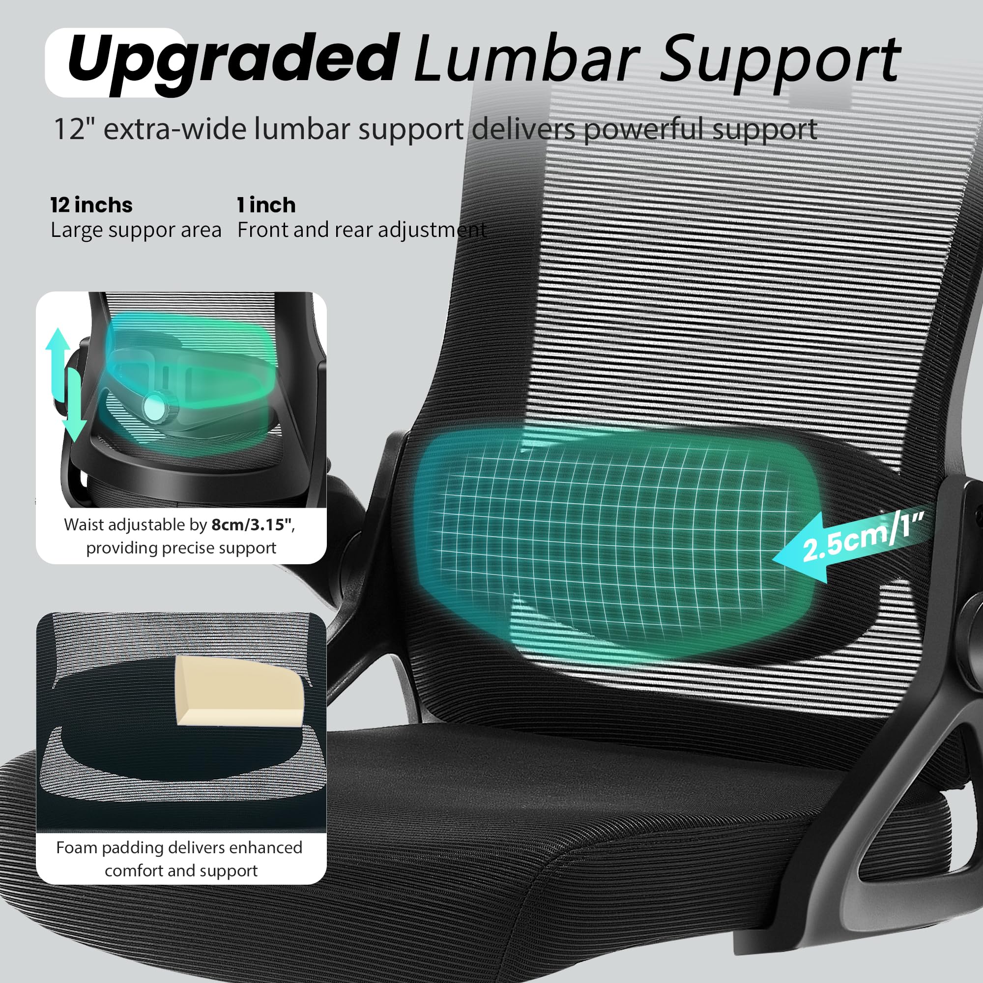 - Adjustable Lumbar Support and Headrest: Our computer chair headrest can be adjusted up and down 3.9 inches, also can adjust the angle, while the lumbar support system can be adjusted 1 inch forward and backward, up and down 3.15 inches, which can perfectly fit the human body's neck, lumbar, and back spine, to protect the health of the neck, spine, and to enhance the sense of comfort (adjusted according to your height and body type)