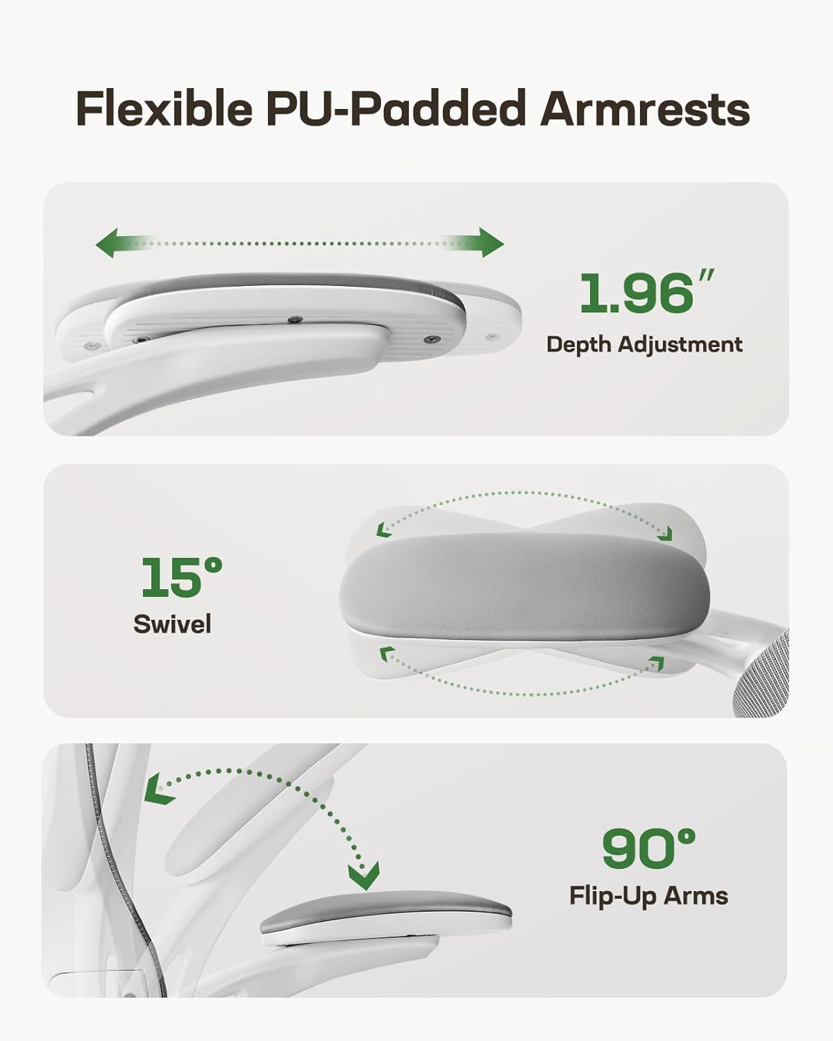 - Flexible Armrests: Move smoothly rounded PU-padded armrests forward or back and swivel them left or right to find the optimal arm position. Flip the armrests up when you want more freedom or to easily slide the ergonomic chair under the desk.